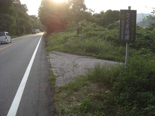 青山西5丁目信号交差点より、途中右に青山保育所をみて300m程国道を進むと、左にホテルサンシャイン青山がありその手前を左に折れて迂回します。国道をそのまま進むと、その先で左に大きくカーブして新笹峠(山田峠)を越えます。