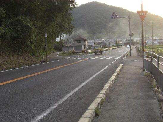 そしてその先で左斜めに国道より左に分岐する旧道がありますので、横断歩道で車に注意して渡ります