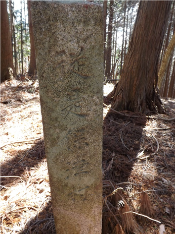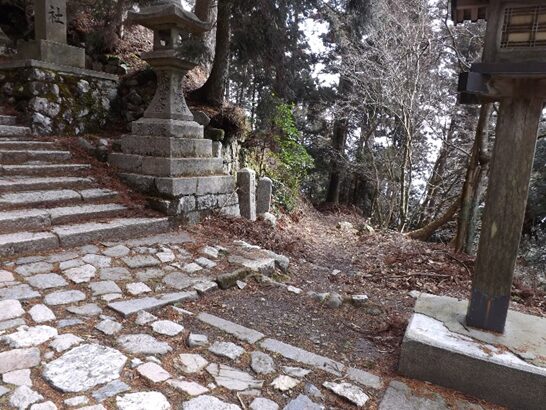 石段の途中右に入る地道の細い道があります、すぐ先で前述の道と合流します。角の 燈籠の袂に道標が立っているのでこの道が正しいかも