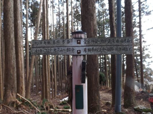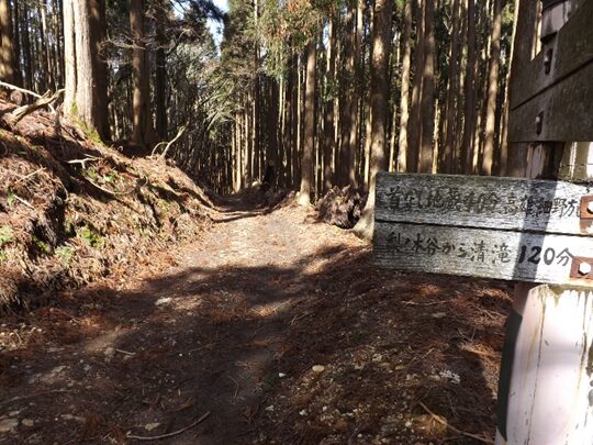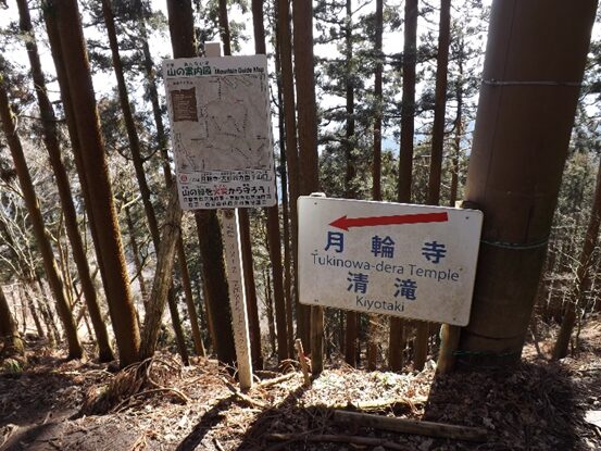 すぐ先で右の急斜面を下る道があり、案内標示があります。月輪寺から清瀧に下る道です、愛宕神社へ登る一つのルートです(この道は歩いていません)