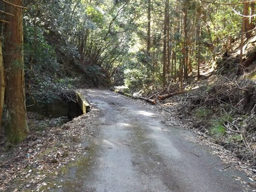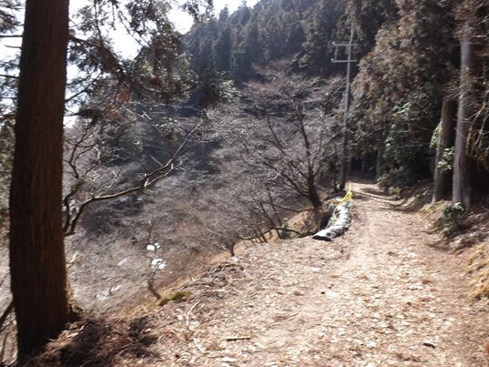 この辺りに来ると、谷川も数十m下になり、足を踏み外して下に落ちると大変、ガードレールもありませんので危険。車の通行止めもよくわかります。大雨ごとに倒木と地崩れによる道路もえぐれていくようです