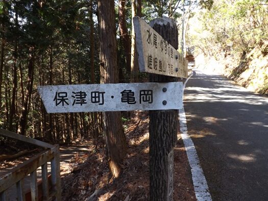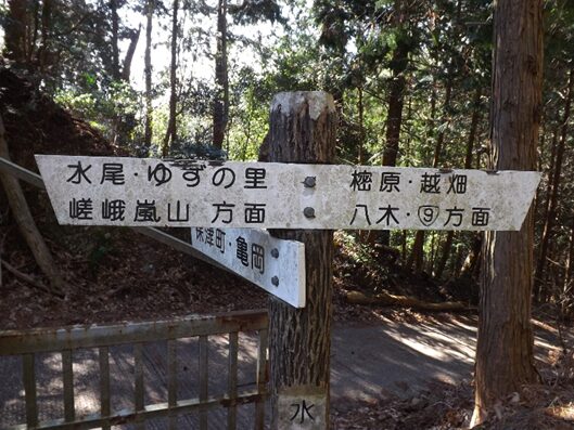 新しい道の舗装道を下っていくと、水尾・ゆずの里、嵯峨嵐山方面の標示。亀岡へはここを右に折れます