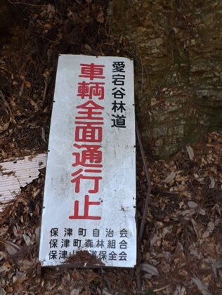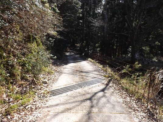 右鋭角に下る道は、愛宕谷林道で車両通行止めの扉があります
