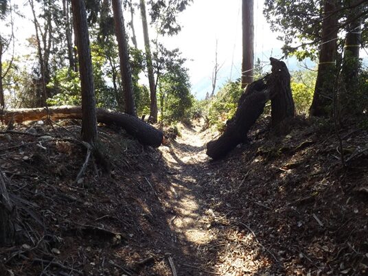 溝道を頼りに下っていきますが、倒木等で道はあれています