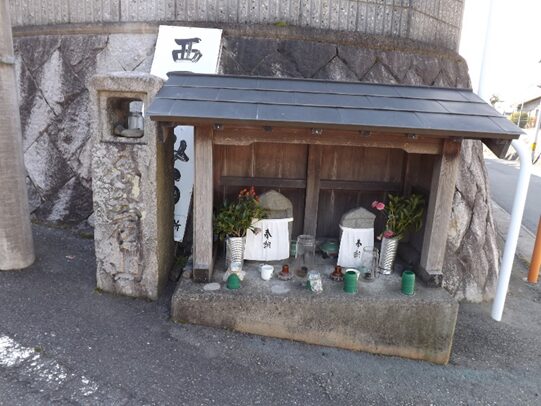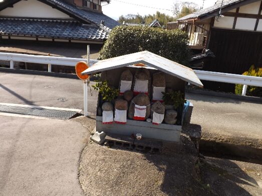 辻の左に多数の お地蔵さんの祠 道路に背中を向けています