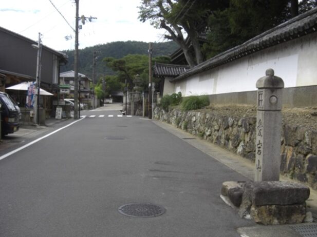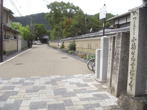 山門前の 石碑や道標 が並ぶ ここ山門前で嵯峨街道と分かれる、嵯峨街道は東へ、愛宕街道は西へ