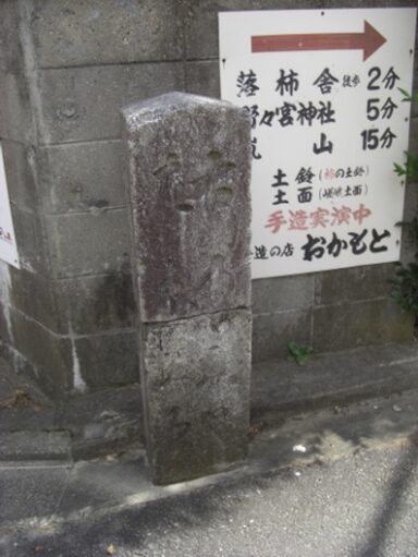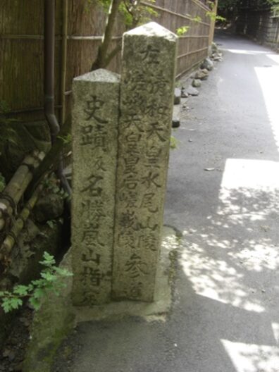 すぐ左に 二基の道標 「史跡 名勝嵐山…」 「左 清和天皇水尾山陵 嵯峨天皇皇后嵯峨陵 参道」