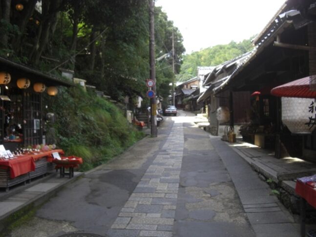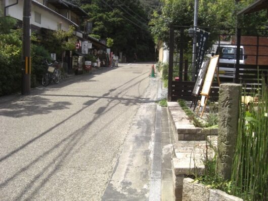 あだし野念仏寺の門前の道で土産屋が並ぶ街並み