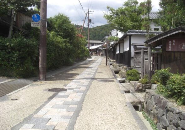 左にカーブするこの界隈は京都市の肝いりで保存地区として再生され、昔の面影が色濃く残る街並み景観となっている