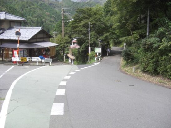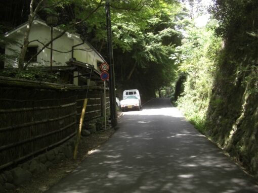 かつての愛宕鉄道清滝駅があった、現在バス停になっているところで、ここで道は二手に分かれるが狭い左の道を下る。