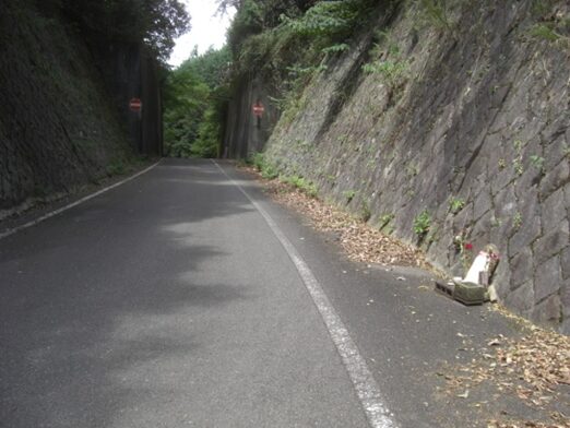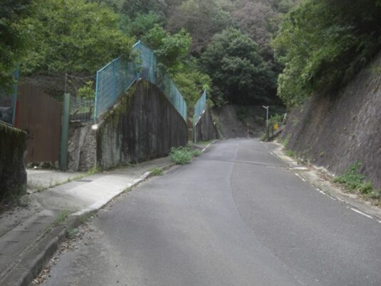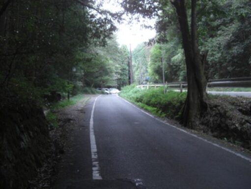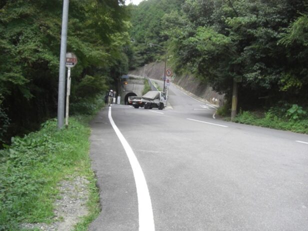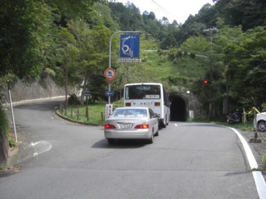 峠を越えて反対側に出ると、そこは参道十二町目の清滝。左にトンネルが抜けてくる道