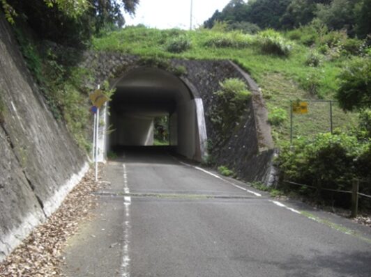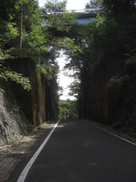 愛宕鉄道遺構のトンネルの右に 試峠の道 があり深い切通しになっています