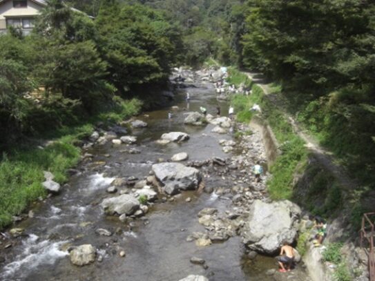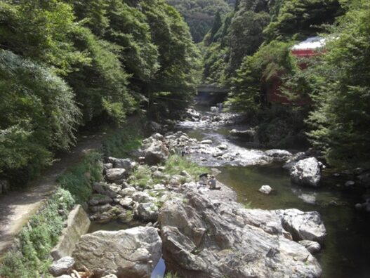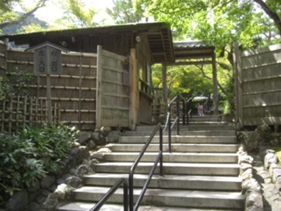 急坂を下ると清滝川の瀬音が聞こえる。かつて清滝は愛宕神社への登り口の休憩地であった。分岐する左のお店は、二十丁目の登り途中であった、茶屋一文字屋 です