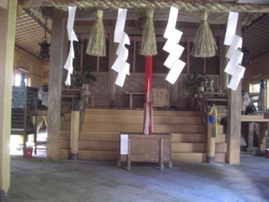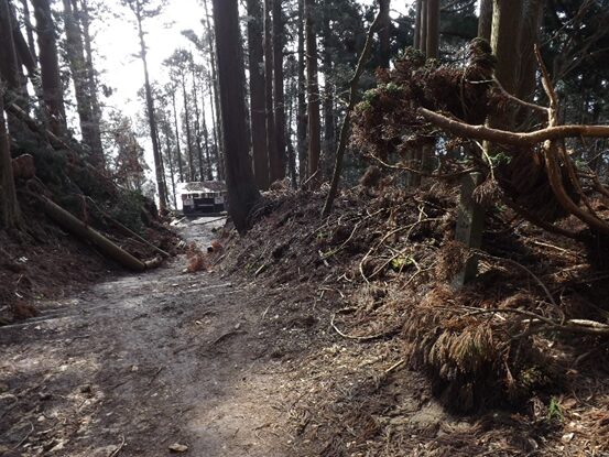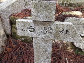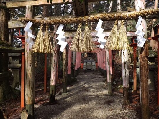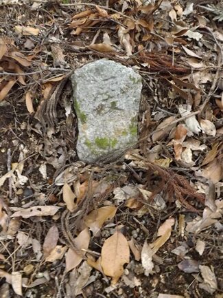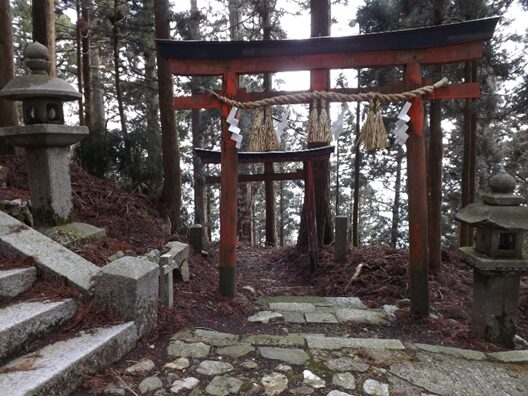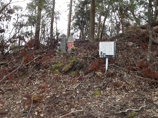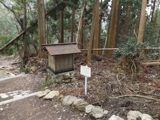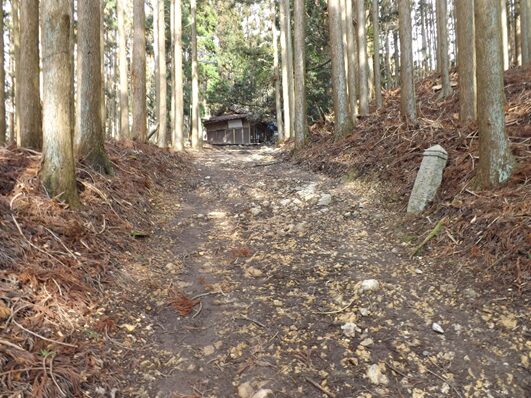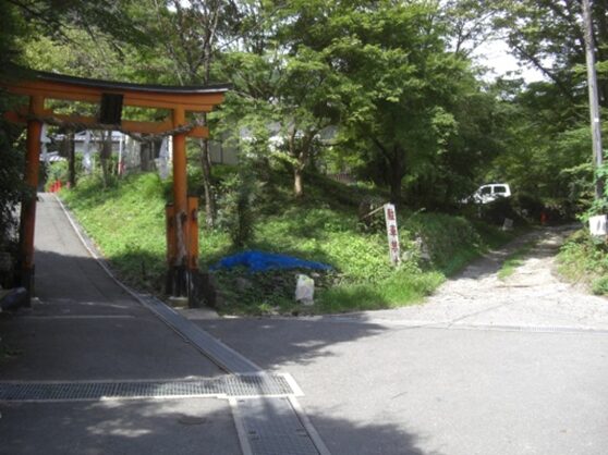 跡は少し平坦な広場になっています。かつて二間一間の朱塗りの社があり、山頂の愛宕社と同じ火の神火産霊命を祀っていました