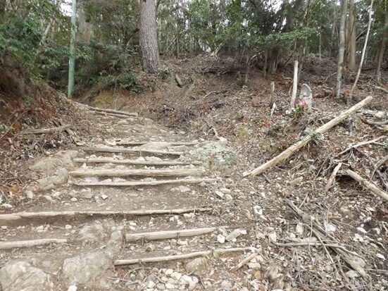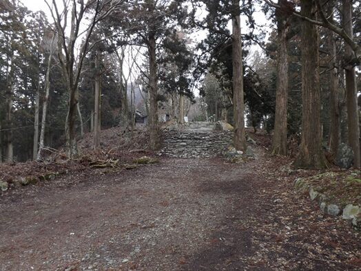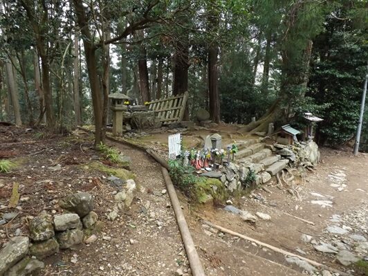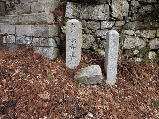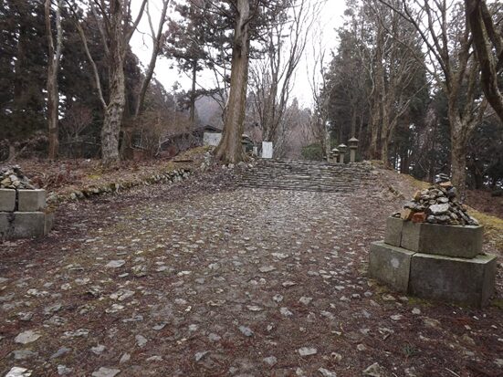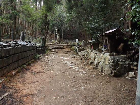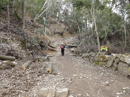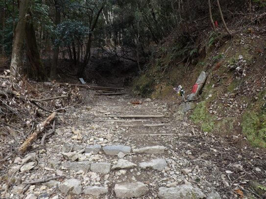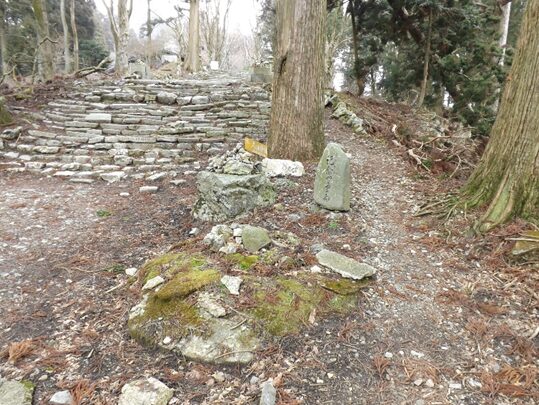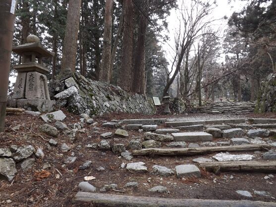 黒門を過ぎて少し登っていくと、石垣や灯篭があり石段道が広くなりますかつての建物跡