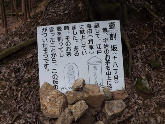 かつて宇治茶を山上に貯蔵して江戸幕府に献上していたが、その茶壺を割ってしまったところからこの坂の名が付いた