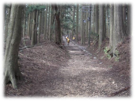 宿場を抜けると 朱色の二の鳥居をくぐると、いよいよ登り道となる。ケーブル跡を横に見ていきなり急坂になります。鳥居を潜ると登り山頂まで五十丁、標高差800mの急坂です