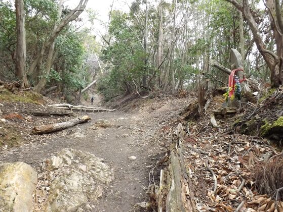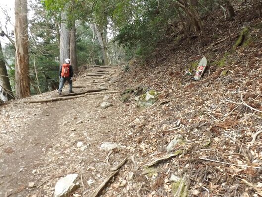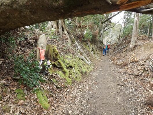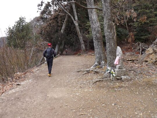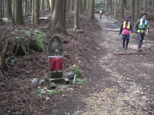 左の お地蔵さん を見ながら進む、非常に厳しい登り道ですが素晴らしく気持ちが良い