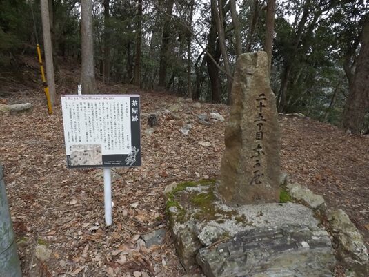 参拝客や観光客は昭和四年(1929)に開通した愛宕ケーブルを利用したため、ほとんどの茶屋は清滝に移った。ここ三十丁目にあった「水口屋」はケーブル山頂駅の南側に移転して、料理旅館として昭和十九年まで営業を行っていたが、廃線とともに廃業を余儀なくされた。石垣などが残り当時の面影を偲ぶことができる