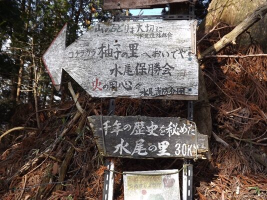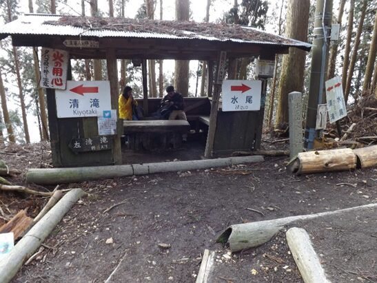 小屋の前の分岐点、愛宕山へは右に折れる左真っ直ぐ下る道は、水尾への道