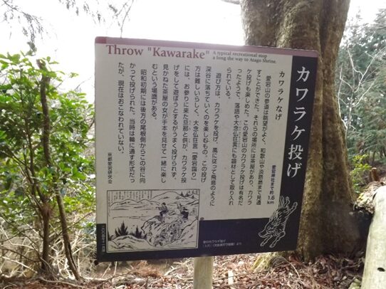 愛宕山の参道からの眺望がよく、和歌山や淡路島まで見ることができた。それらの場所に茶屋がありカワラケ投げが楽しめたが現在は行われていない