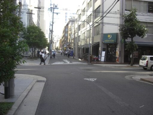 左に折れたなにわ筋、南方向を見る