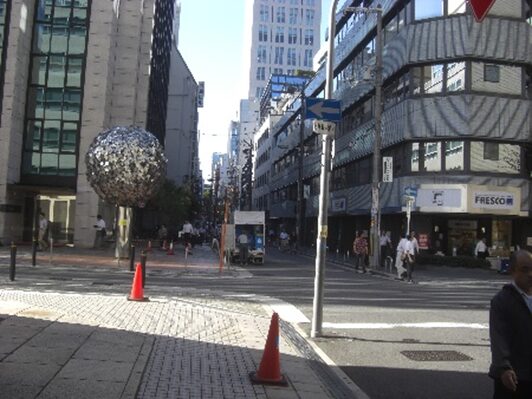長堀通りの広い交差点に出る、交差点の南側に 旧心斎橋の橋柱等が残されている