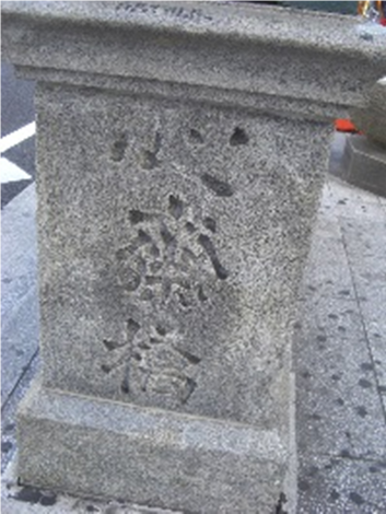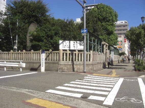 十三間堀川と七瀬川の合流地点にあった橋で十三間堀川は昭和45年阪神高速建設に伴い埋め立てられた。