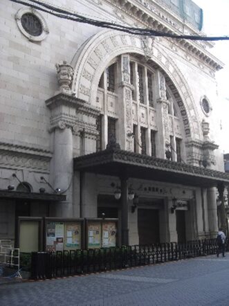 道頓堀筋右手左に年輪を重ねた松竹座が見える
