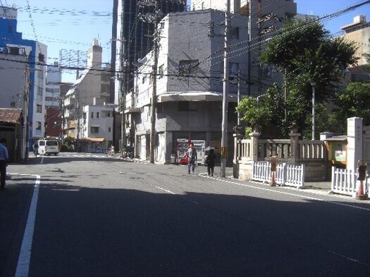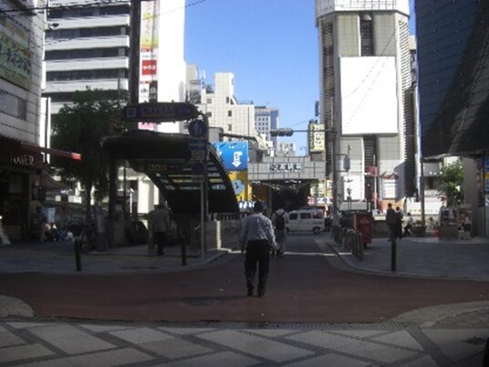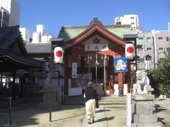 地下鉄御堂筋線・四つ橋線の大国町駅の大きな大国交差点に出る。大国交差点の先、真っ直ぐ行くのか道が解らないので、ここで右折れして、300mほどに敷津松之宮神社があるので(寄り道)をする。敷津東へ