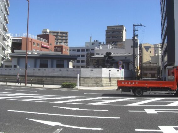 この先の街道はどの道かわからないので、とりあえず元の広い道の大国交差点に戻る。交差点からすぐ広い自動車道の向かい、国道の南側(左側)にある 願泉寺