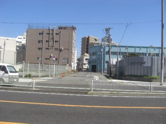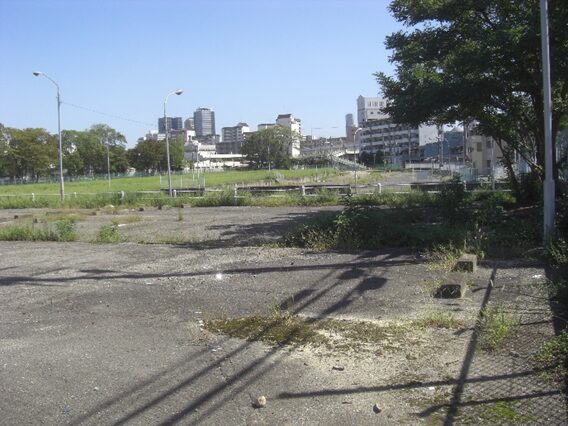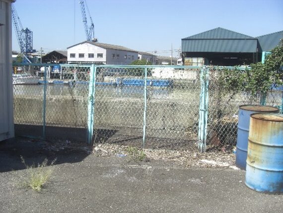 正面の倉庫の敷地の向こう側が木津川