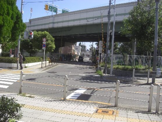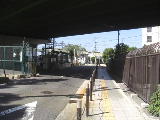 阪神高速道路の高架下、すぐ隣接して南海高野線汐見橋線の踏切を渡る
