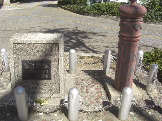 広場の陸橋の下に 琴江橋跡の碑と橋の親柱