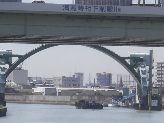 下流をみると 半円形の木津川水門 が見える