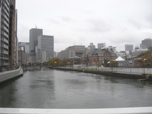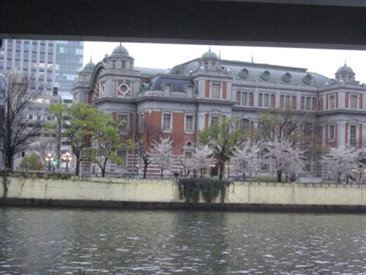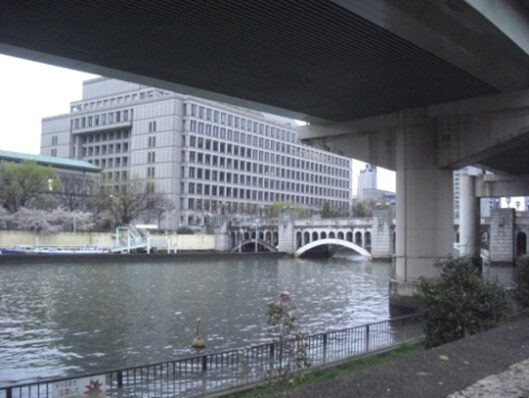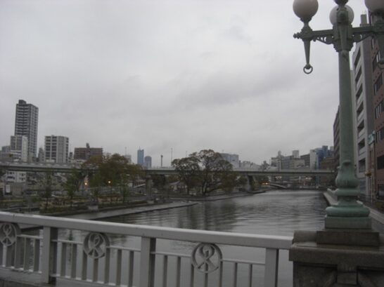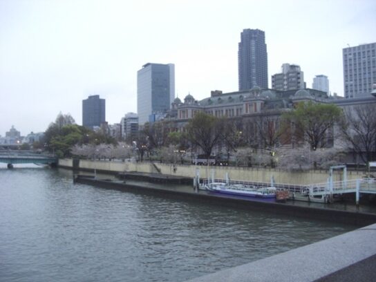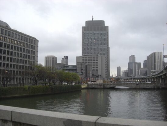 堂島川の西 大阪市役所、御堂筋を挟んで西側が日本銀行大阪支店