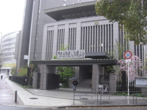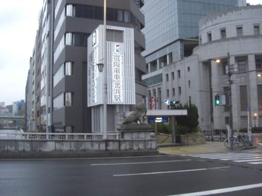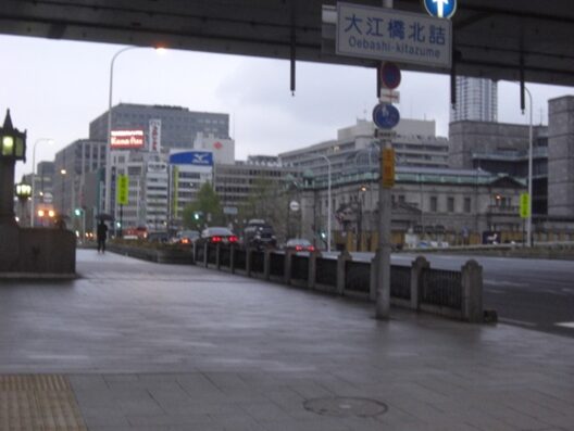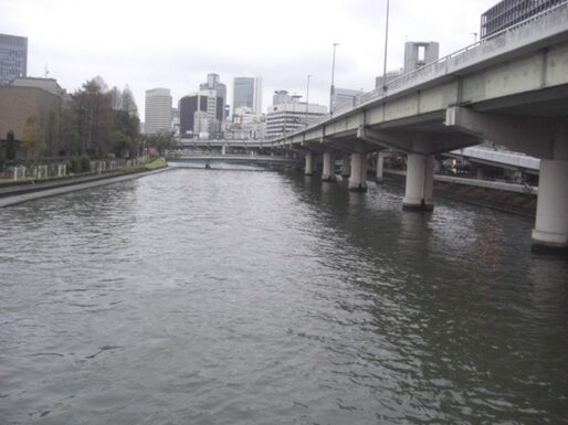 図書館を挟んで 大阪市役所 川に架かる御堂筋の大江橋