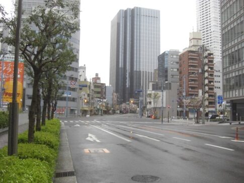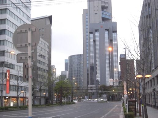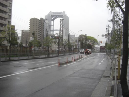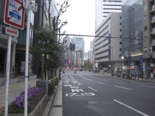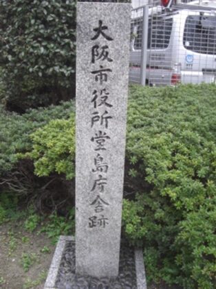 街道沿いの左側に、大阪市役所堂島庁舎跡の石柱