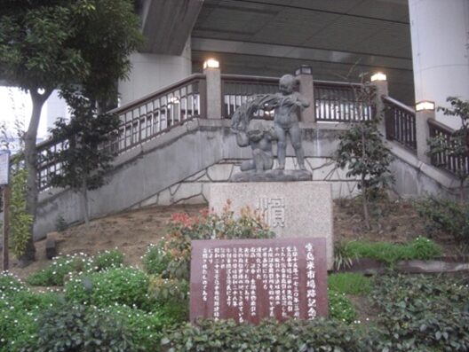 1730年幕府は堂島米市場に米の先物取引である張合米取引を公認した、その取引の手法は現在の大阪証券取引所を始めとする世界各地における組織化された、商品・証券・金融先物取引の先駆をなすみにであり、先物取引発祥の地とされている。背後の像は昭和28年彫刻家横江嘉純氏により制作された