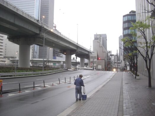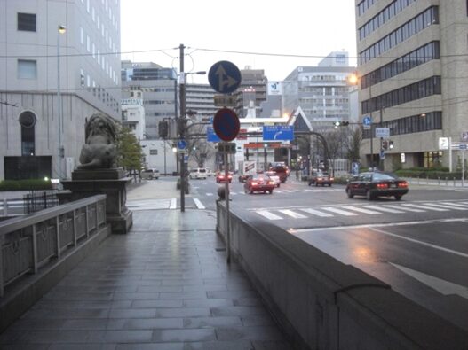 淀屋橋へ、大阪堂島川に架かる難波橋よりスタート。6時25分。あいにくスタート時は小雨模様であるが雨があがる予想。今日は短い街道を、梅田新道・尼崎街道・御堂筋と歩く予定。