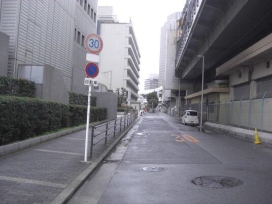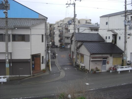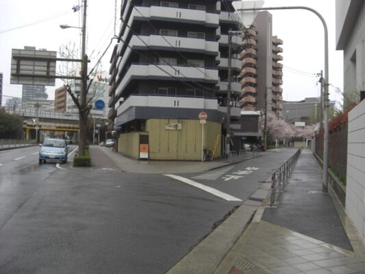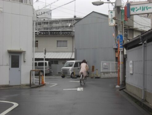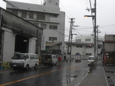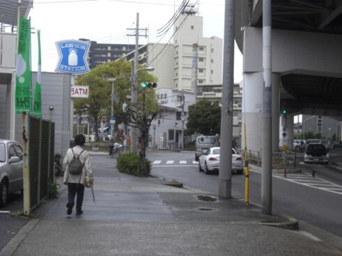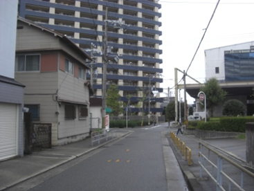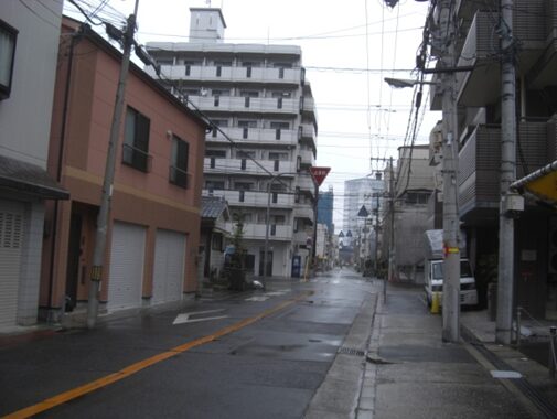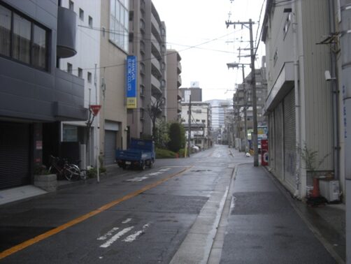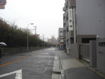 八丁橋を渡り、高速を右に離れ真っ直ぐ100mほど進む、左に市営御幣島東住宅1号館、少し右斜めに折れ、すぐまた交差点を左に、右にパークスクエア・レピア御幣島東公園を見て信号のあるすぐの交差点を右に折れる。