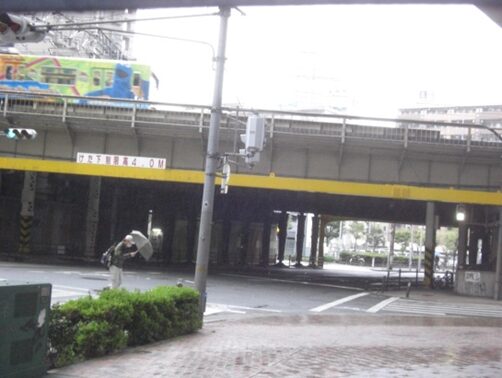 交差点を渡り、阪神高速の高架を潜り、その先で大阪環状線・東海道本線のガードを潜る