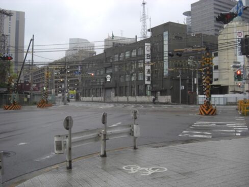 梅田ランプ西交差点、右に日本通運の所を、左に折れる、貨物引き込み線を超える