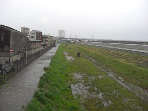 柏里2丁目、この辺りは淀川改修以前の旧中津川の左岸でかつてはここから、槲の橋、野里の渡しがあった。明治9年には「槲(かしわ)の橋」があって有料の木橋が架けられていた