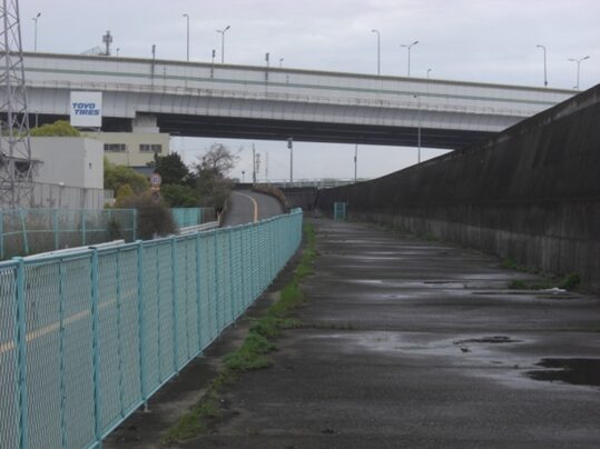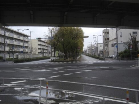 その先が阪神高速11号池田線の高架に突き当たるので、高架に沿って左に進む