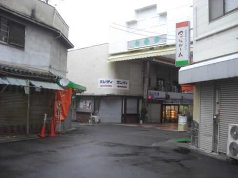 更にすぐ先を、右斜めからすぐ左に曲がる右に行けば商店街アーケードの入り口、その前を左