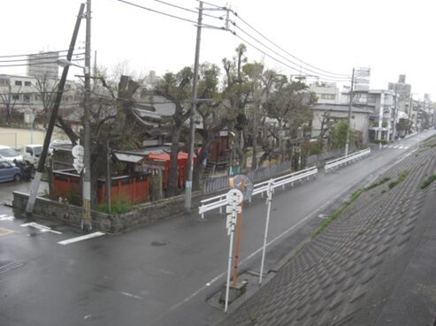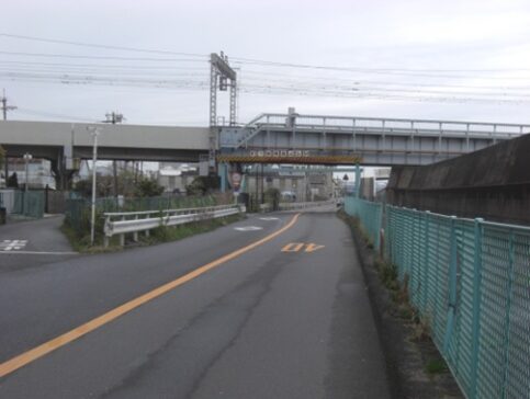 神社を右に、突当りを左に折れる。東海道本線の高架がすぐに有るが、高架下を潜らず手前を右に折れる。50mほどで再び、(株)秋田のところを右に折れる。左は東海道線