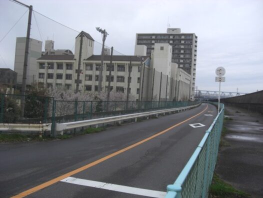 元の道に戻り突き当り左に折れる、正面建物の向こうは神崎川