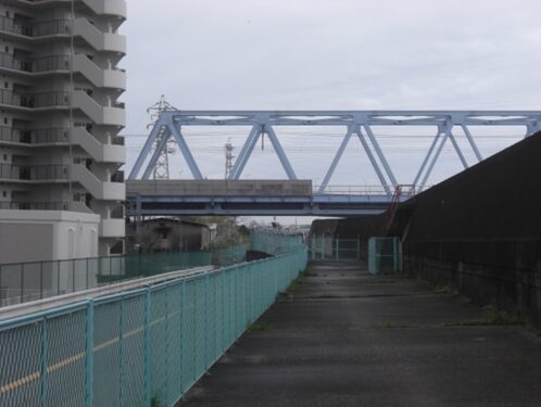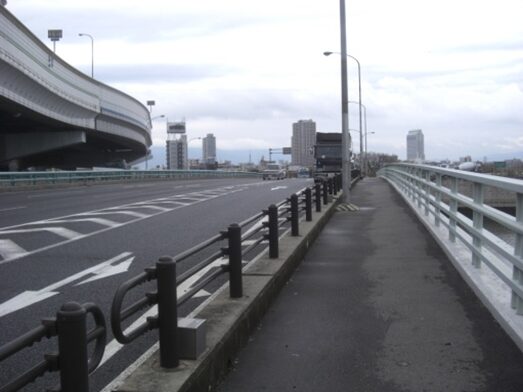 淀川を右に沿って進む、前方に、東海道本線・阪神高速11号池田線の高架を潜る