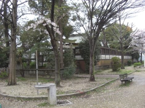 商店街の入口の前を進むと左に柏里西公園があり、鼻川神社御旅所が建つ